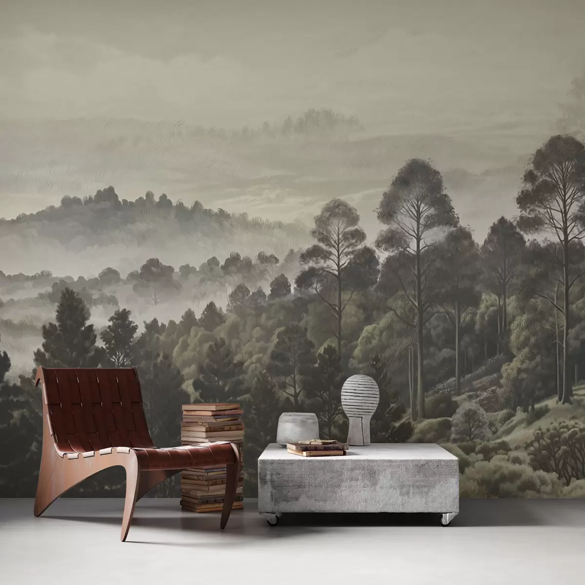 Fotobehang Dicht bos en mistige vallei N° w01871