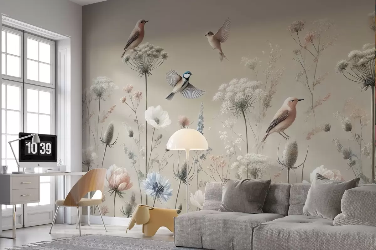 Fotobehang Delicate wilde bloemen met vogels op een beige achtergrond N° w01958