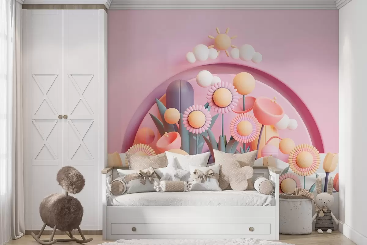 Fotobehang Kinderbehang in 3D-stijl met bloemen en wolken in roze tinten N° w02136