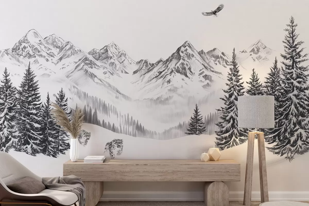 Fotobehang Winterbergen, sneeuwluipaarden, dennenbos, potloodtekening, vliegende adelaar N° w02360