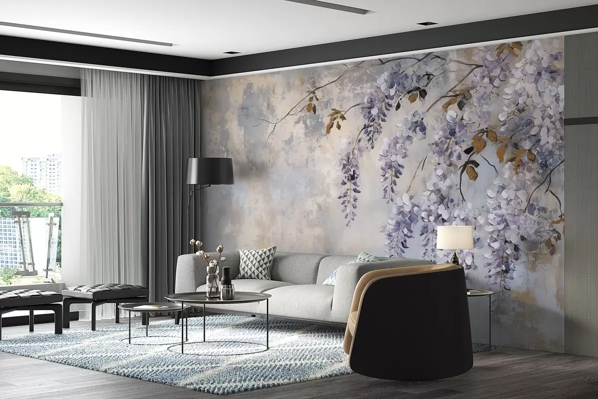 Fotobehang behang met textuur in zachte, gedempte kleuren met delicate blauwe regen bloemen en takken. N° w02451