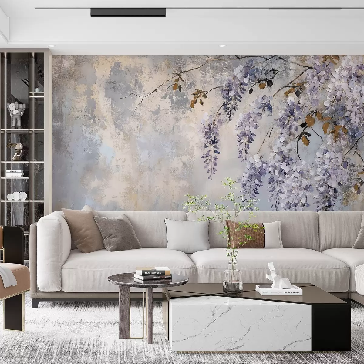 Fotobehang behang met textuur in zachte, gedempte kleuren met delicate blauwe regen bloemen en takken. N° w02451
