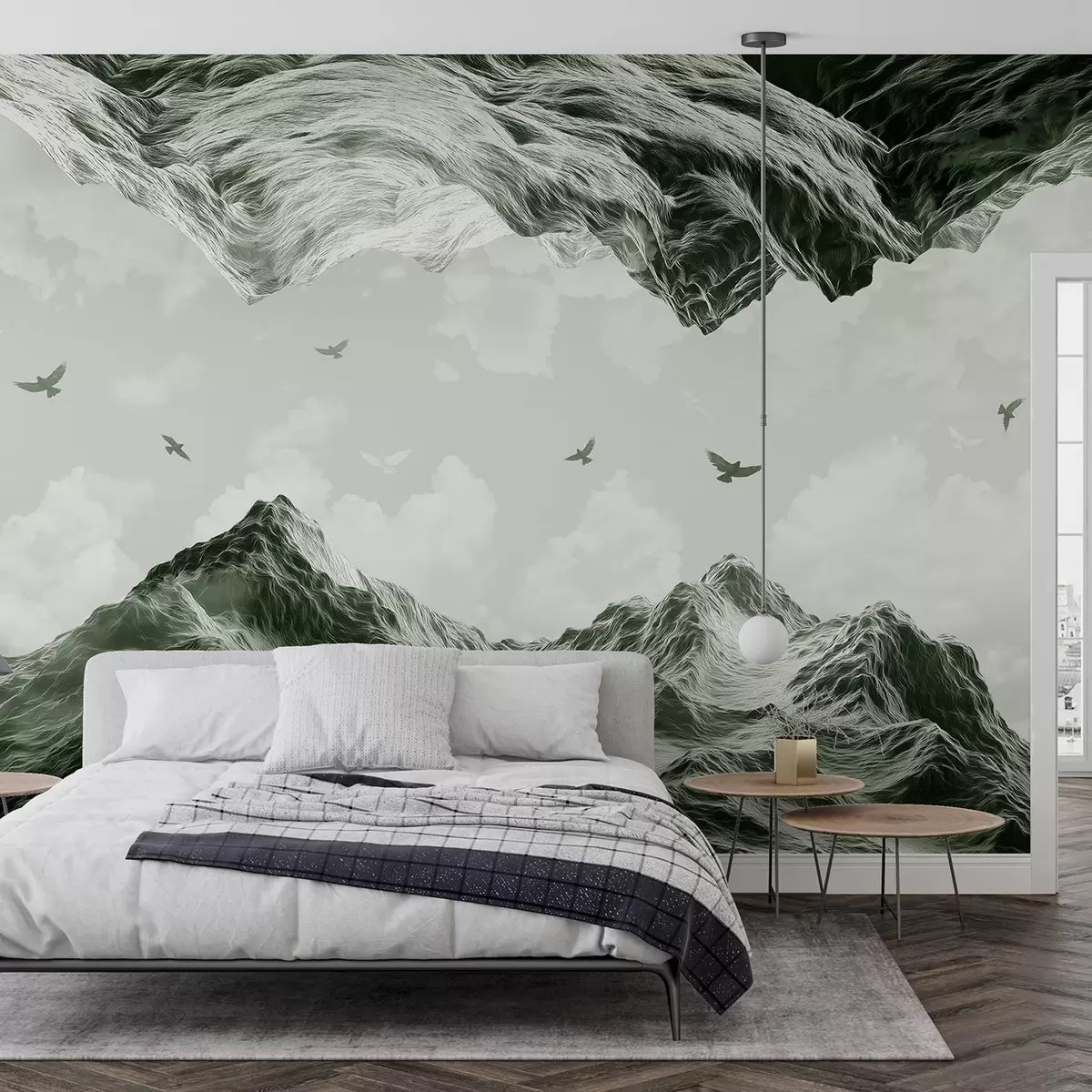 Fotobehang Bergen landschap, realisme, vliegende vogels, natuur, wolken, groene kleuren N° w02514v3