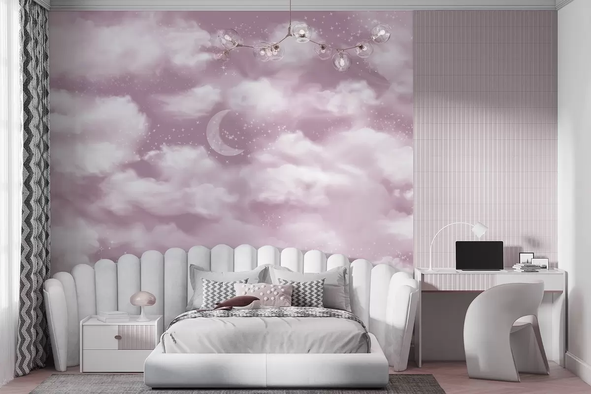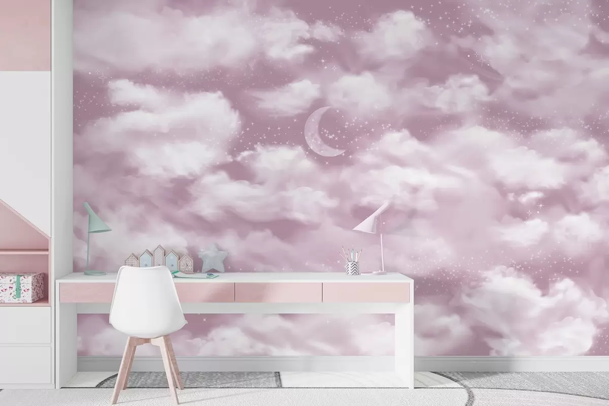 Fotobehang Sterrenhemel met maan en wolken, dromerig, etherisch, zachtroze kleuren N° w02515v3