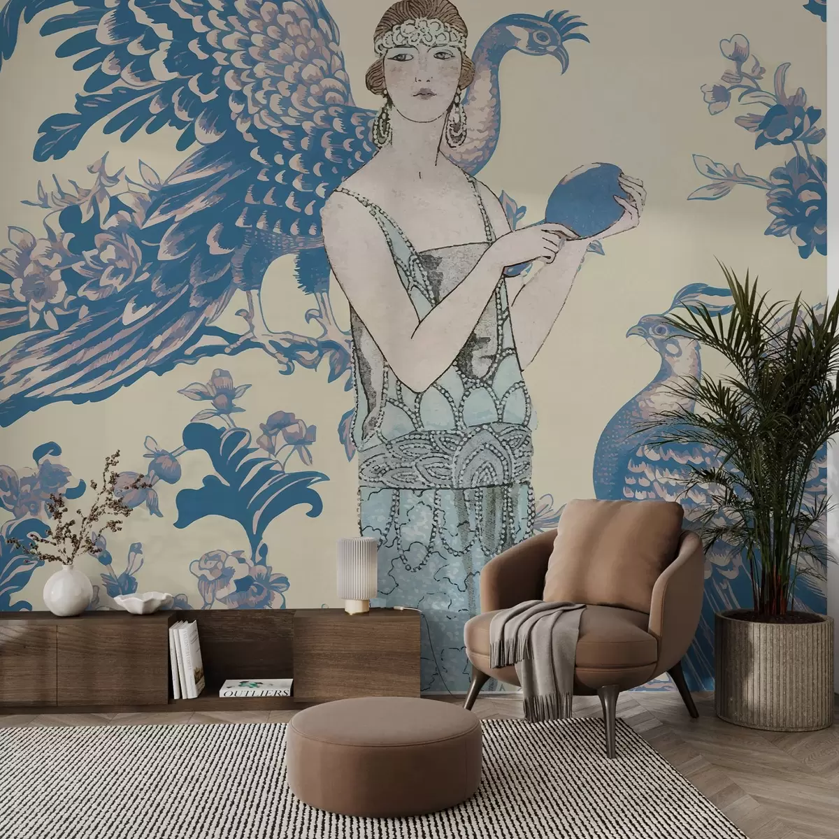 Fotobehang Elegant vintage bloemenpatroon met een vrouw in blauwe en roze tinten N° w02532