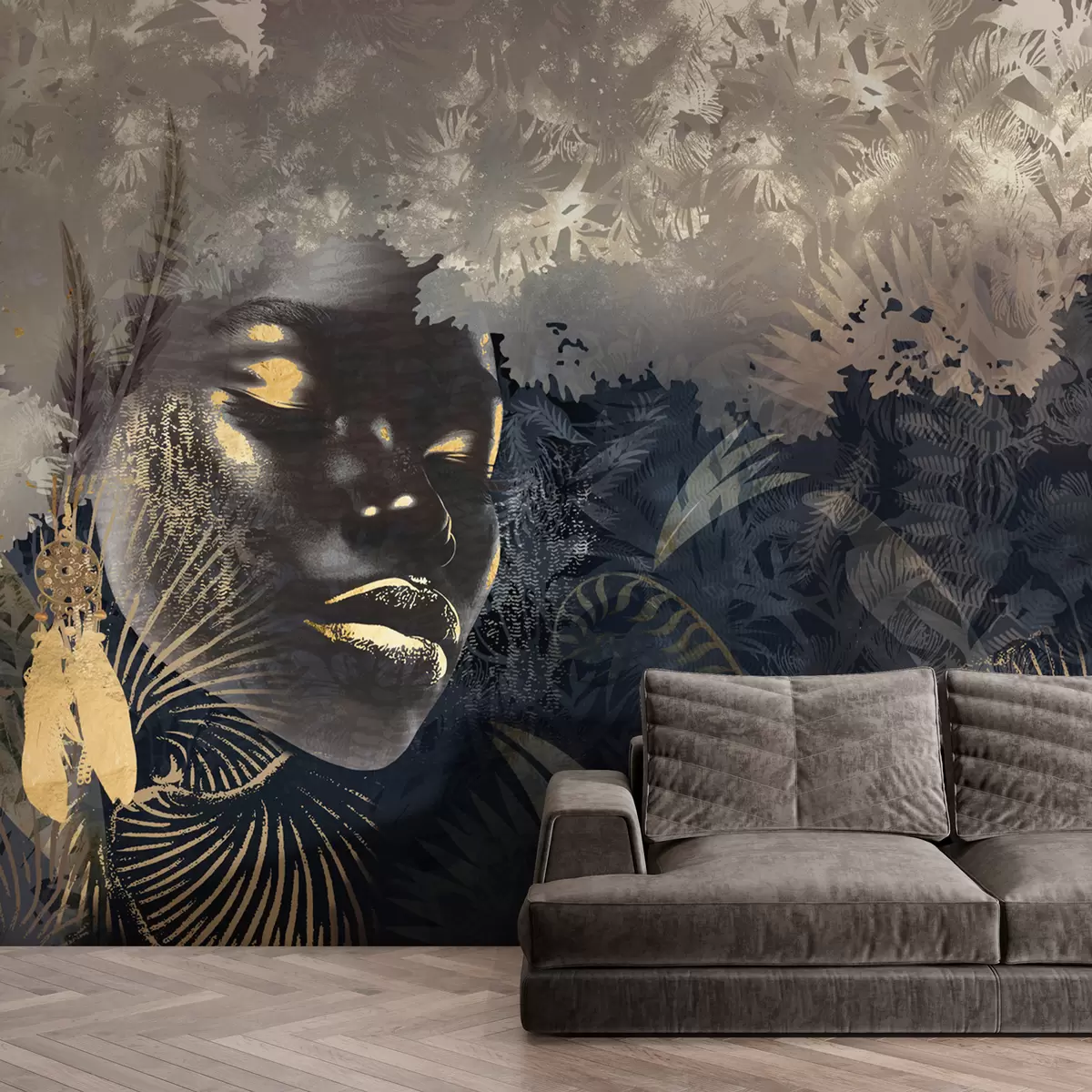 Fotobehang Magisch Afrika met regenwoud, meisjesachtig en vectorelementen met blauwe tint N° w02642v1