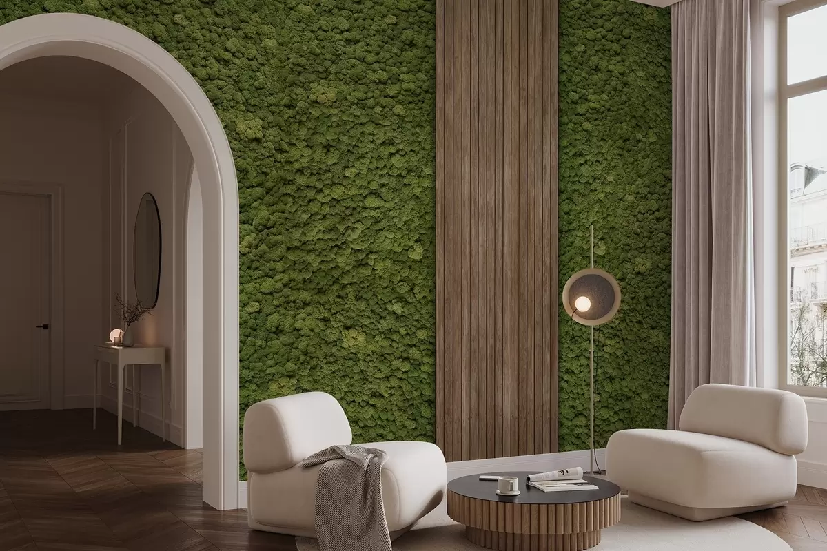 Fotobehang Moss-stijl muur met houten paneel, weelderige olijfkleuren N° w02656v3