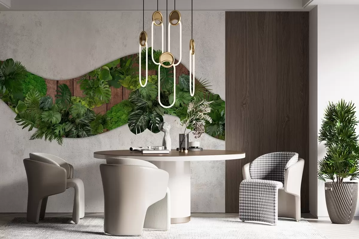 Fotobehang Wandornament met planten, mos, palmbladeren, houten achtergrond N° w02658
