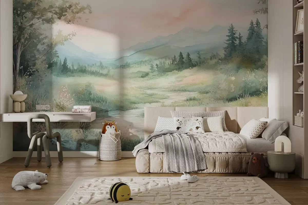Fotobehang aquarel landschap met een pad en bergen N° w02764