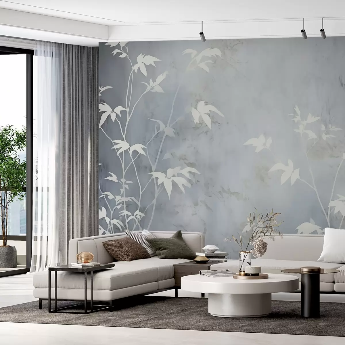 Fotobehang Witte silhouetten van vegetatie op een gestructureerde gevlekte achtergrond N° w02792
