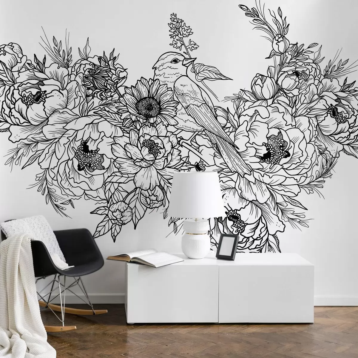 Fotobehang Gedetailleerde lijntekening van vogel en bloemstuk N° w02833v1
