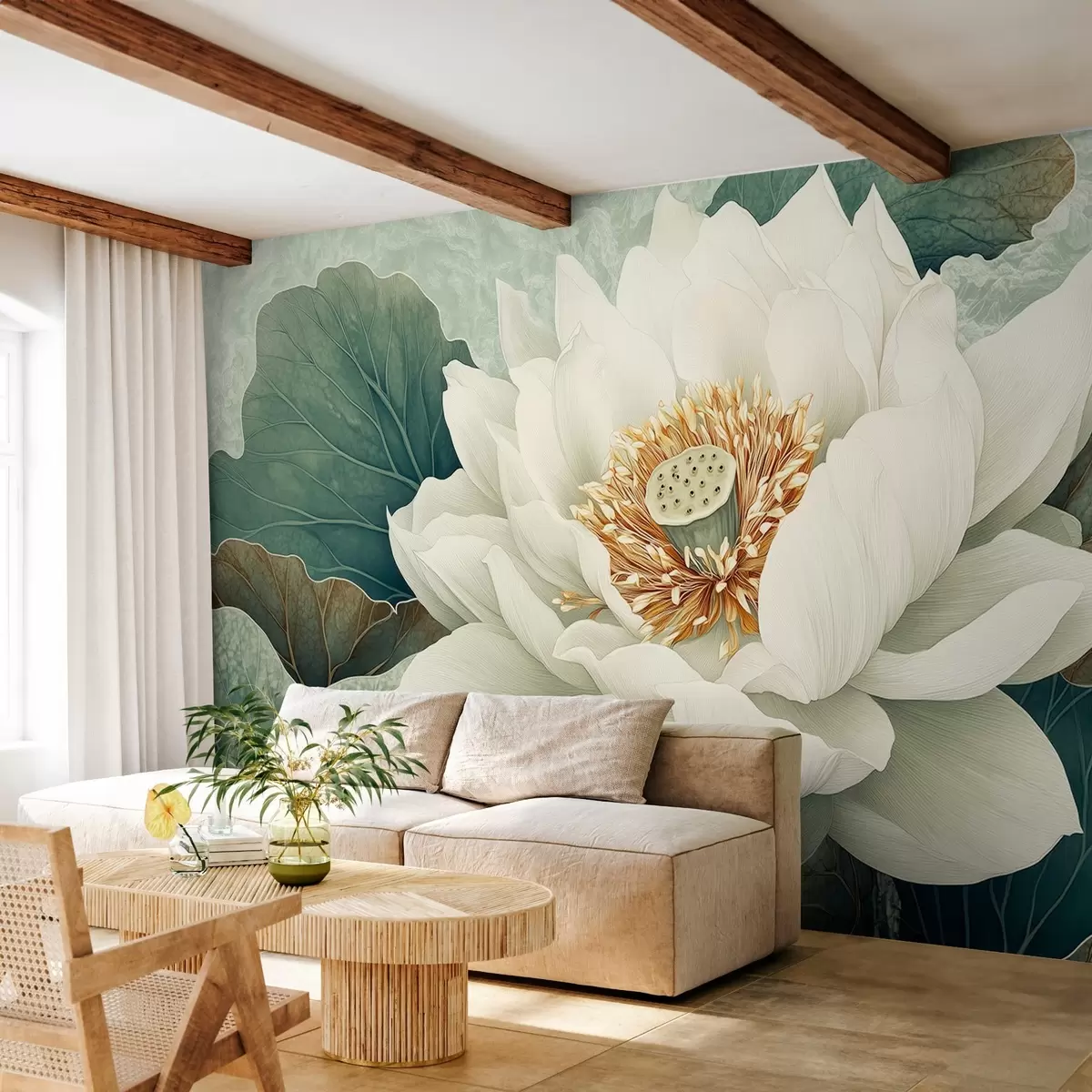Fotobehang Grote waterlelie tegen een achtergrond van bladeren N° w02905