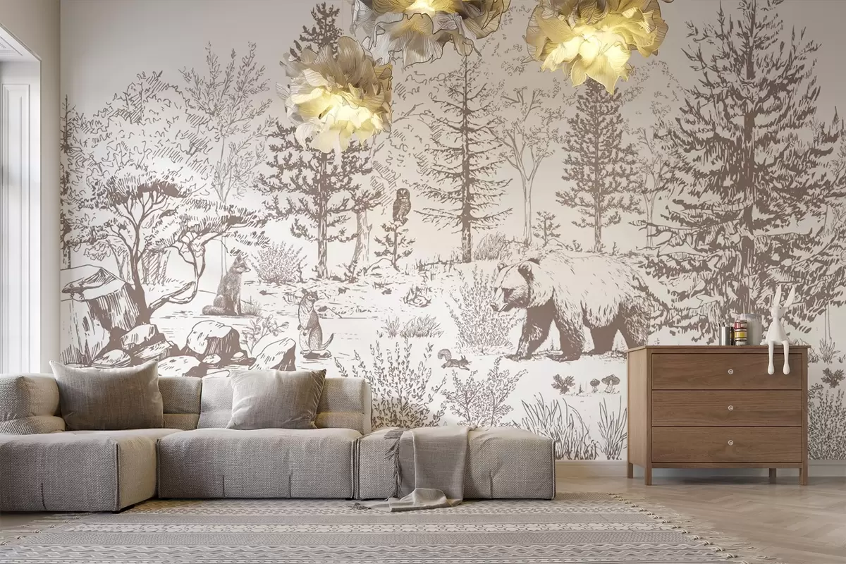 Fotobehang Bosleven, bomen, wilde dieren, beer, vos, uil, struiken, potloodtekening, beige kleuren N° w02929
