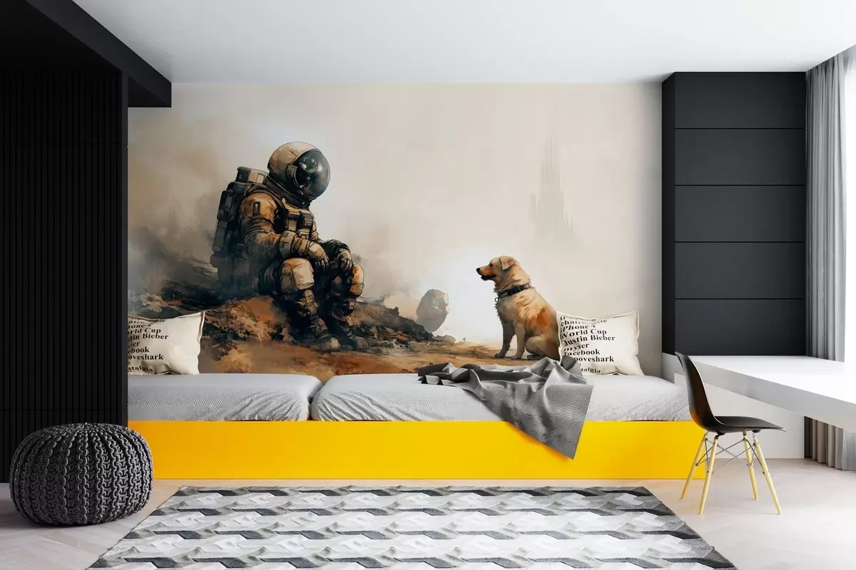 Fotobehang post-apocalyptisch landschap met een astronaut en een hond N° w03115