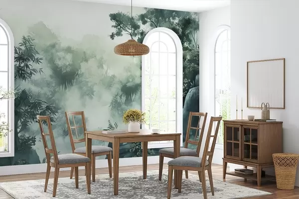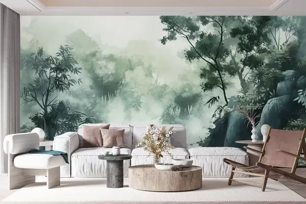 Fotobehang Oosters landschap, jungle, bomen, aquarelstijl, groene kleuren N° w03149