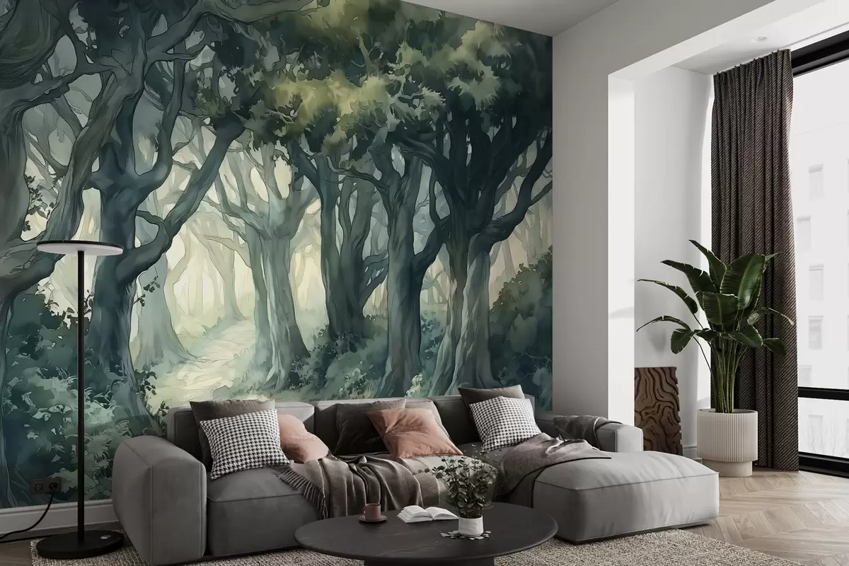 Fotobehang Bos met grote bomen, groene kleur spallete, aquarel stijl tekening N° w03150