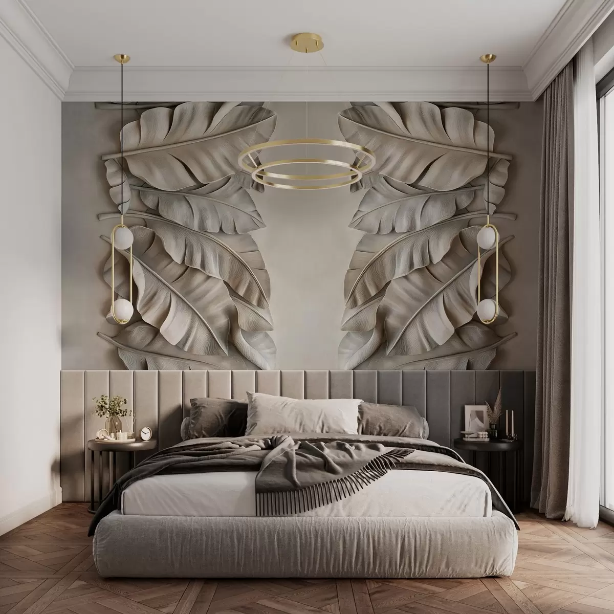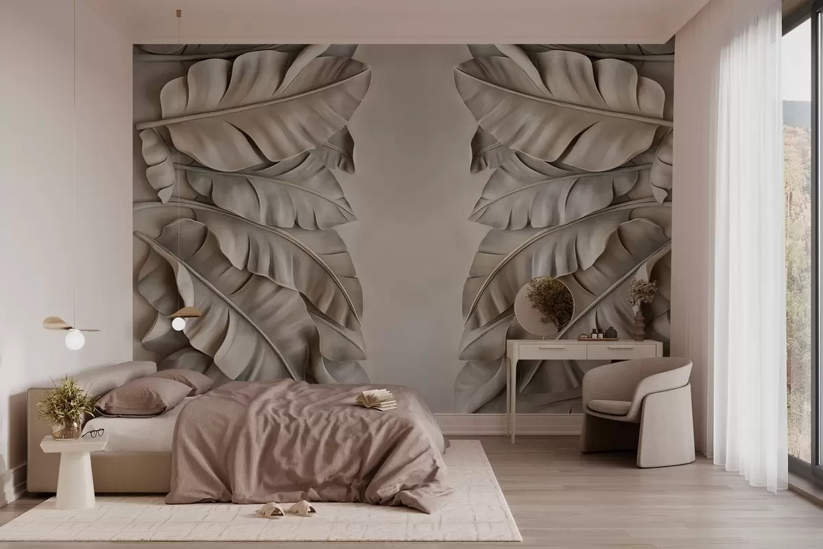 Fotobehang imitatie van een bas-reliëf met tropische bladeren in beige tinten N° w03285