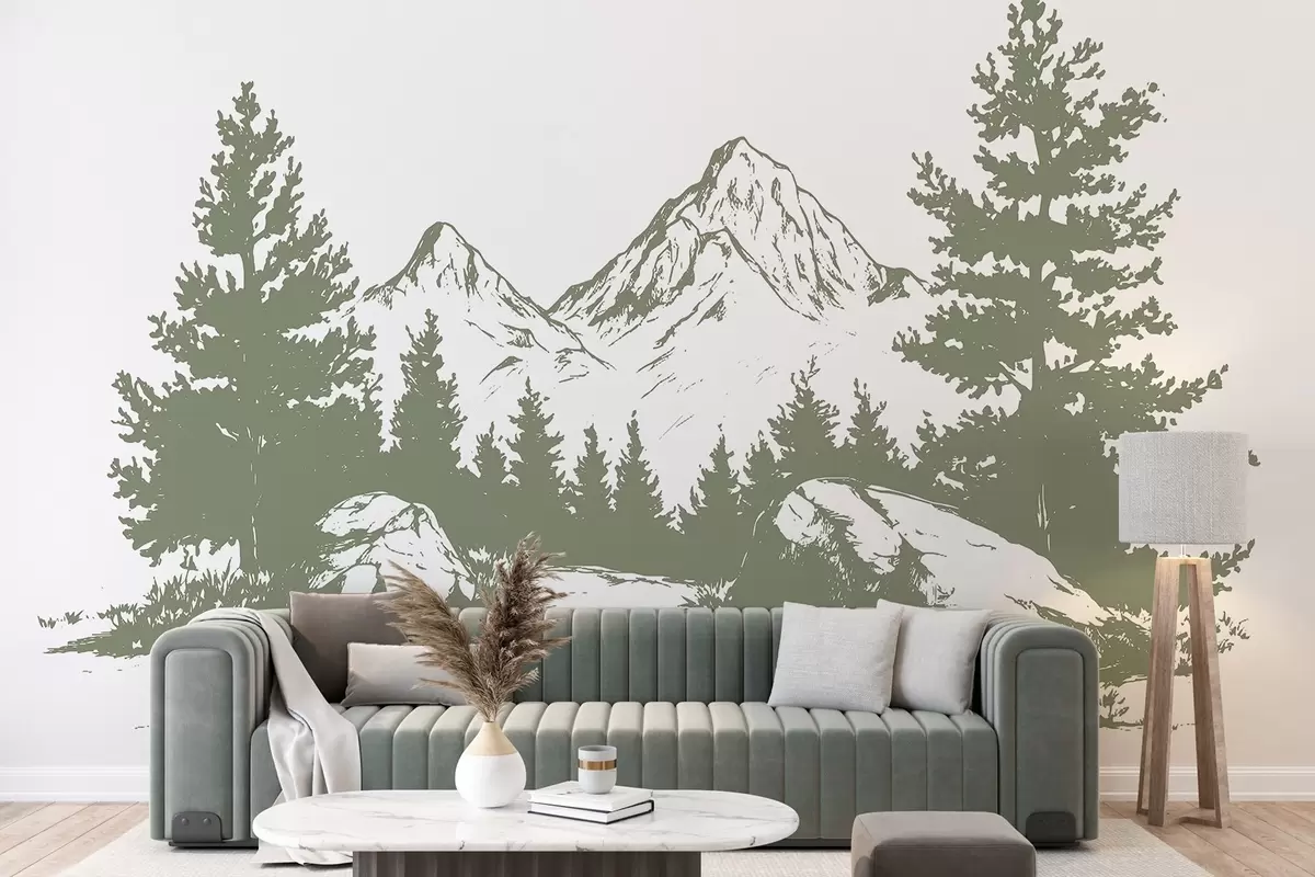 Fotobehang De Alpen, bergen met bos, lijntekening, groene kleur N° w03342v1