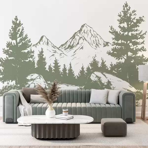 Fotobehang De Alpen, bergen met bos, lijntekening, groene kleur N° w03342v1