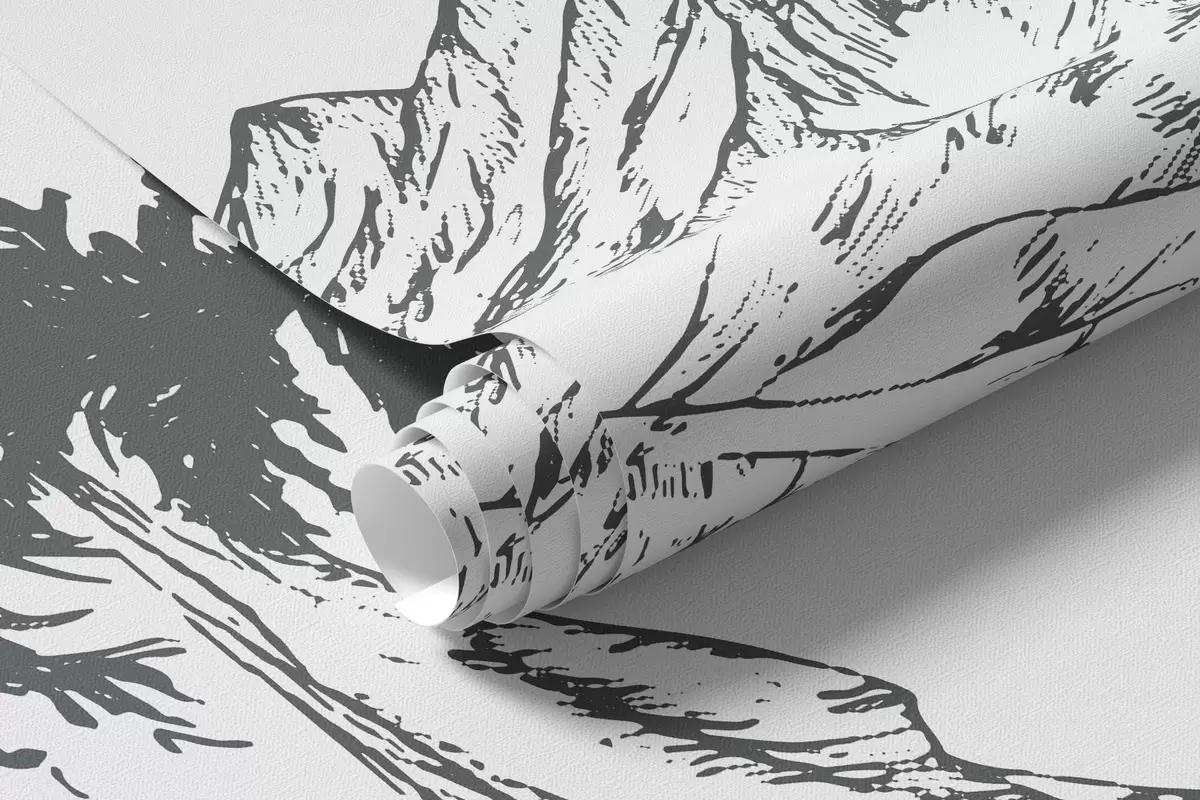 Fotobehang Bergen landschap met pijnbomen, bos, natuur, donkergrijze kleur N° w03344