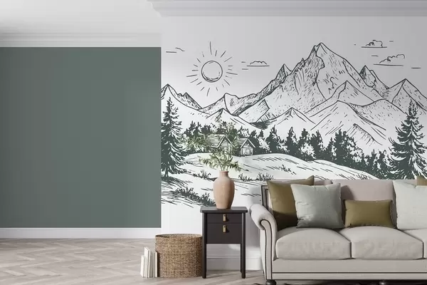 Fotobehang Bergen tekening, natuurlandschappen, bos, houten huizen, groene kleur N° w03347