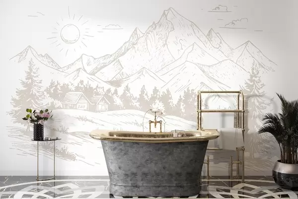 Fotobehang Bergen tekening, natuurlandschappen, bos, houten huizen, beige kleur N° w03348