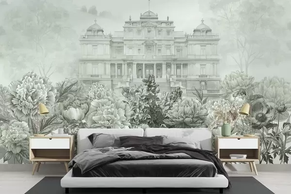 Fotobehang Koninklijk paleis met pioenentuin, aquarelstijl, natuur, groene kleuren, boho N° w03552v2