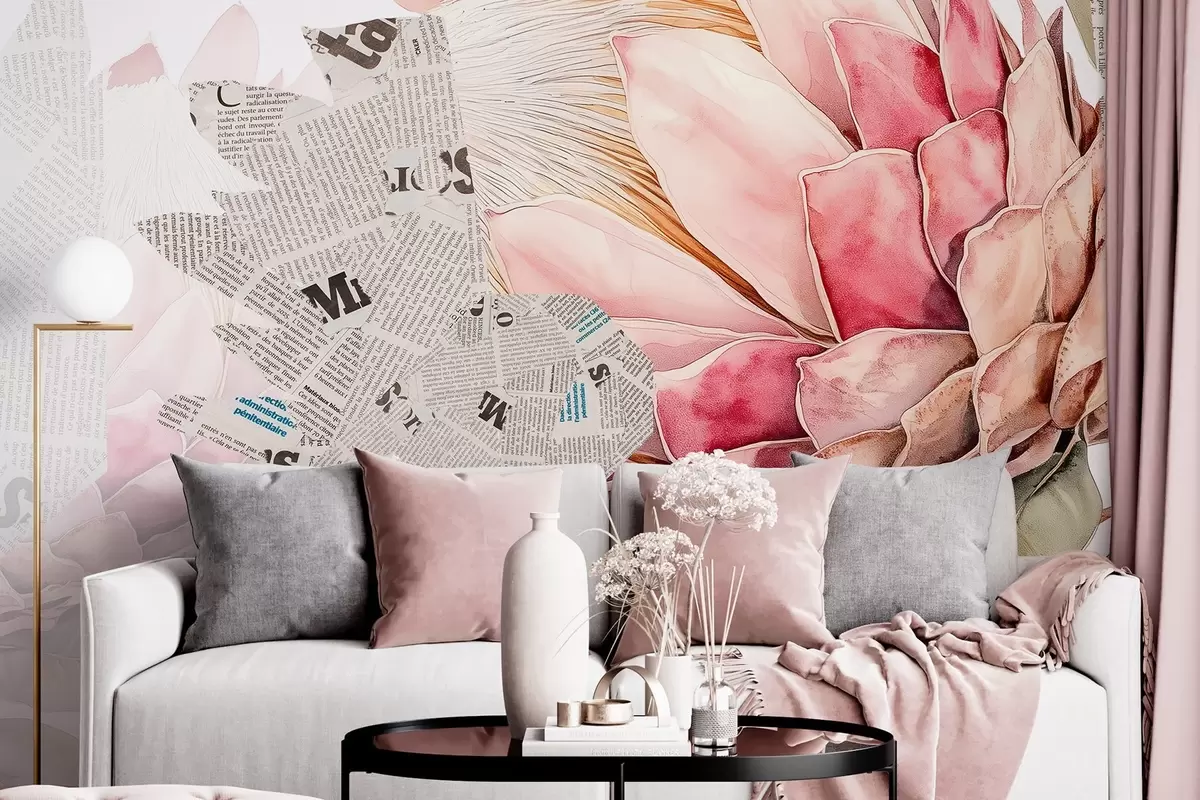 Fotobehang Protea bloemen, krantenkunst, bloemen, tropisch, natuurlijke kleuren N° w03667
