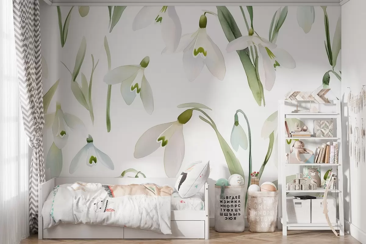 Fotobehang Sneeuwklokjes bloemen in aquarel stijl, natuurlijke kleuren N° w03754