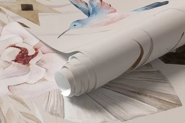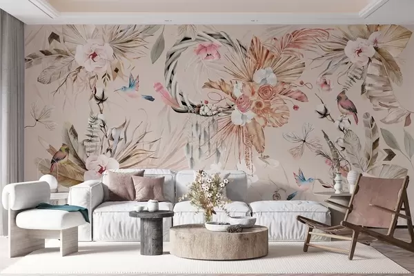Fotobehang Boho stijl ornament met pioen bloemen en vogels, aquarel stijl, zachte kleuren N° w03885v3