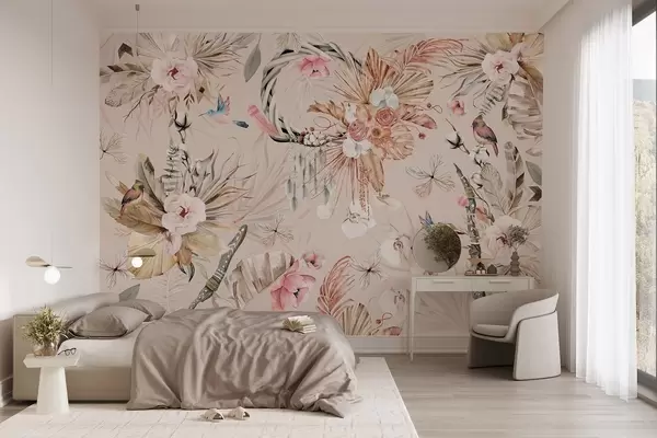 Fotobehang Boho stijl ornament met pioen bloemen en vogels, aquarel stijl, zachte kleuren N° w03885v3