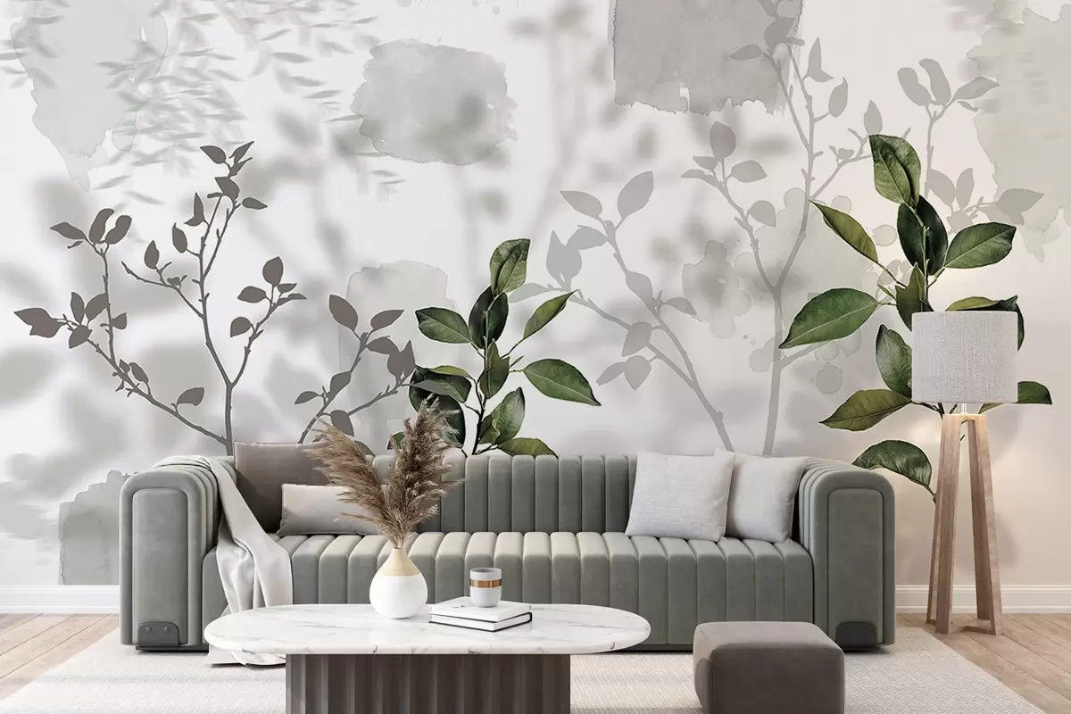 Fotobehang Citroenboom bladeren, boomtakken schaduwen, natuur, aquarel, groen N° w03910v1