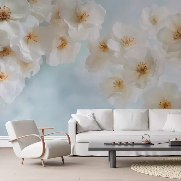 Fotobehang Delicate grote bloemen op een lichtblauwe achtergrond N° w03931v1