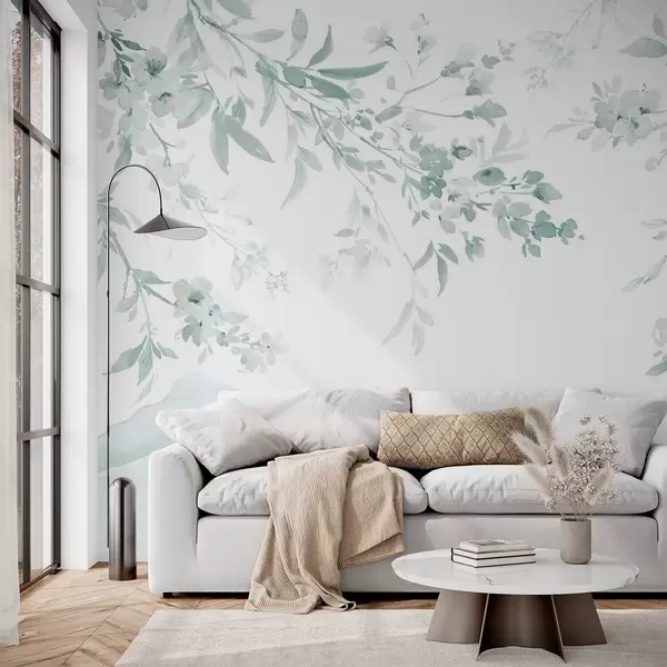 Fotobehang Bloeiende takken, imitatie van aquarel, groene tinten N° w03935v3
