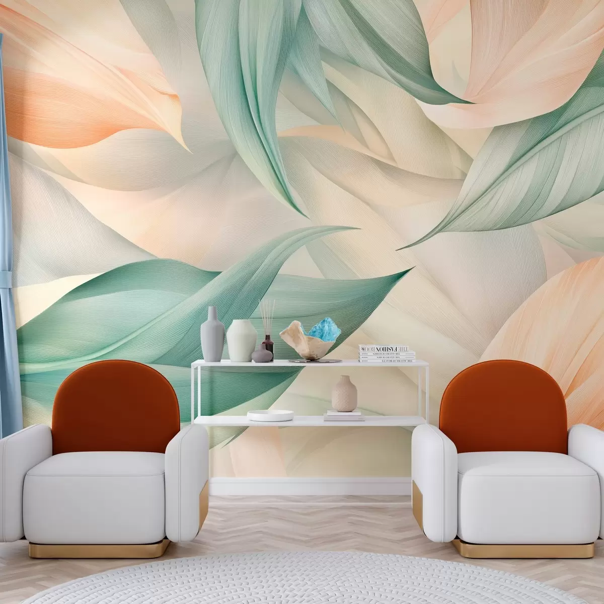 Fotobehang exotische tropische bladeren in delicate perzik- en groentinten N° w03962