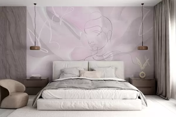 Fotobehang Bloemenabstractie met Boeddha lijntekening, roze kleuren N° w04004v2