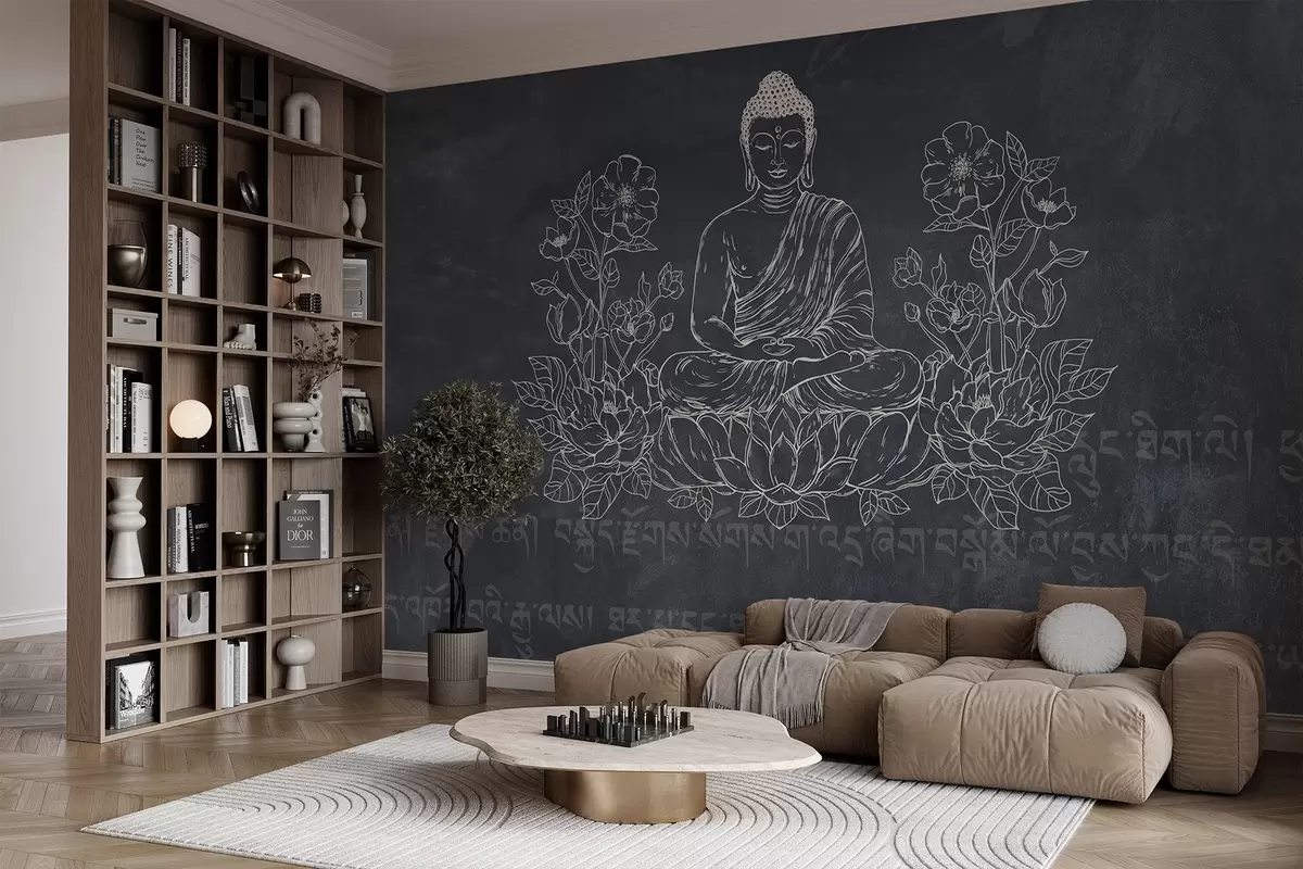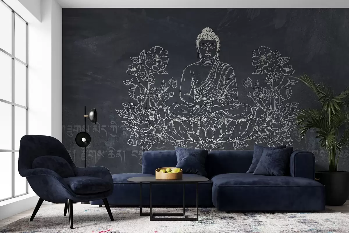 Fotobehang Mediterende Boeddha met lotusbloemen, lijntekening, oosters, donkere achtergrond N° w04008