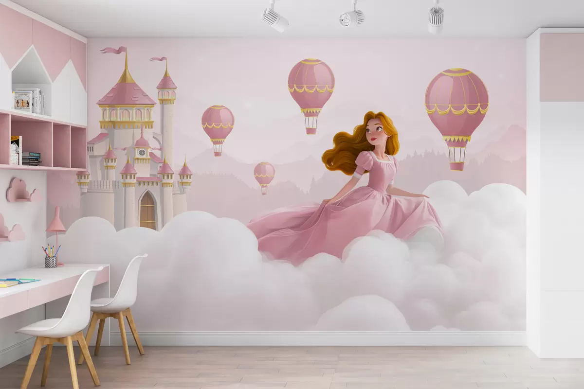 Fotobehang Prinses tussen de wolken op de achtergrond van het landschap met het kasteel N° w04015v1