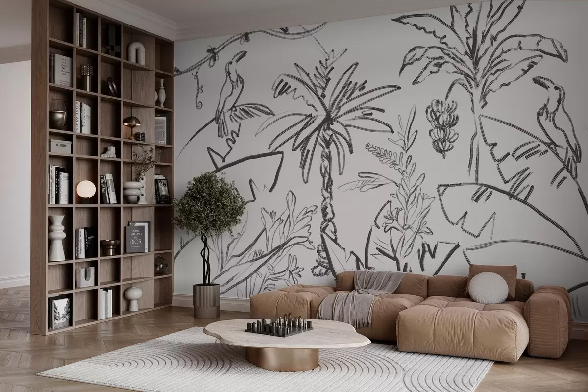Fotobehang Tropische lijntekening, bananen, palmbomen, overzichtsgrafiek N° w04020