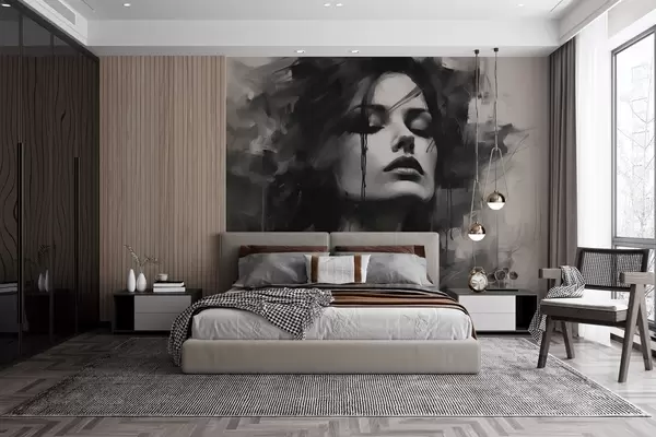 Fotobehang Portret van een vrouw in grijze en zwarte kleding N° w04049