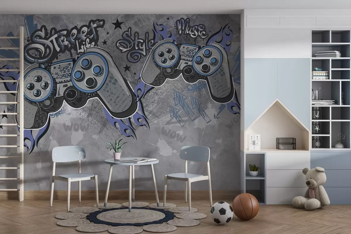 Fotobehang Consoles in street art-stijl op de grungemuur N° w04054