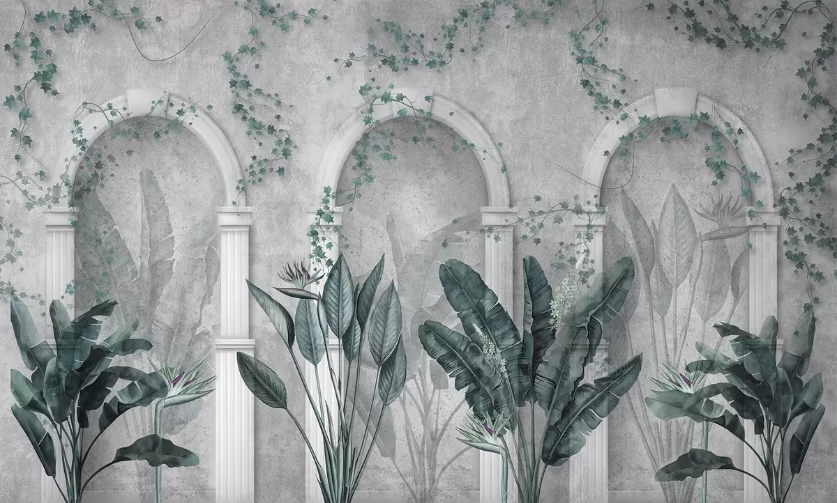 Fotobehang Betonnen muur met bogen en tropische planten, bloemen, blauwe kleuren N° w04065v2