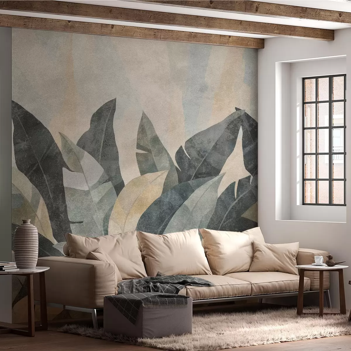 Fotobehang getextureerde bananenbladeren in natuurlijke beige, groene en grijze tinten N° w04285