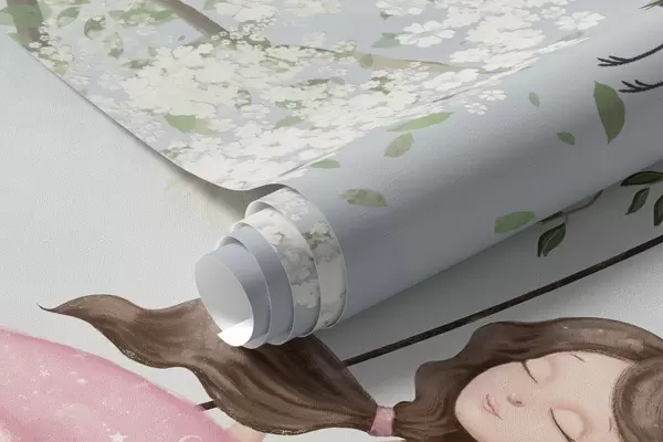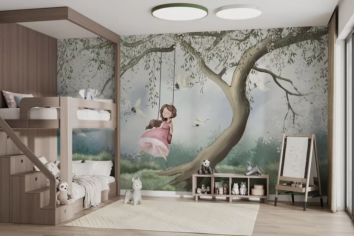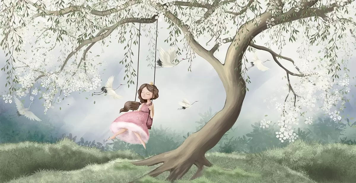 Fotobehang Meisje op schommel onder bloeiende boom met rondvliegende vogels N° w04370