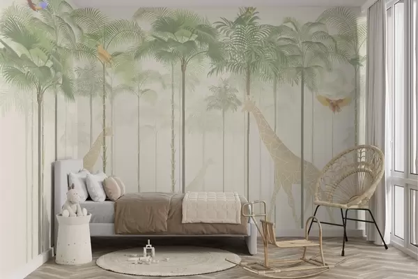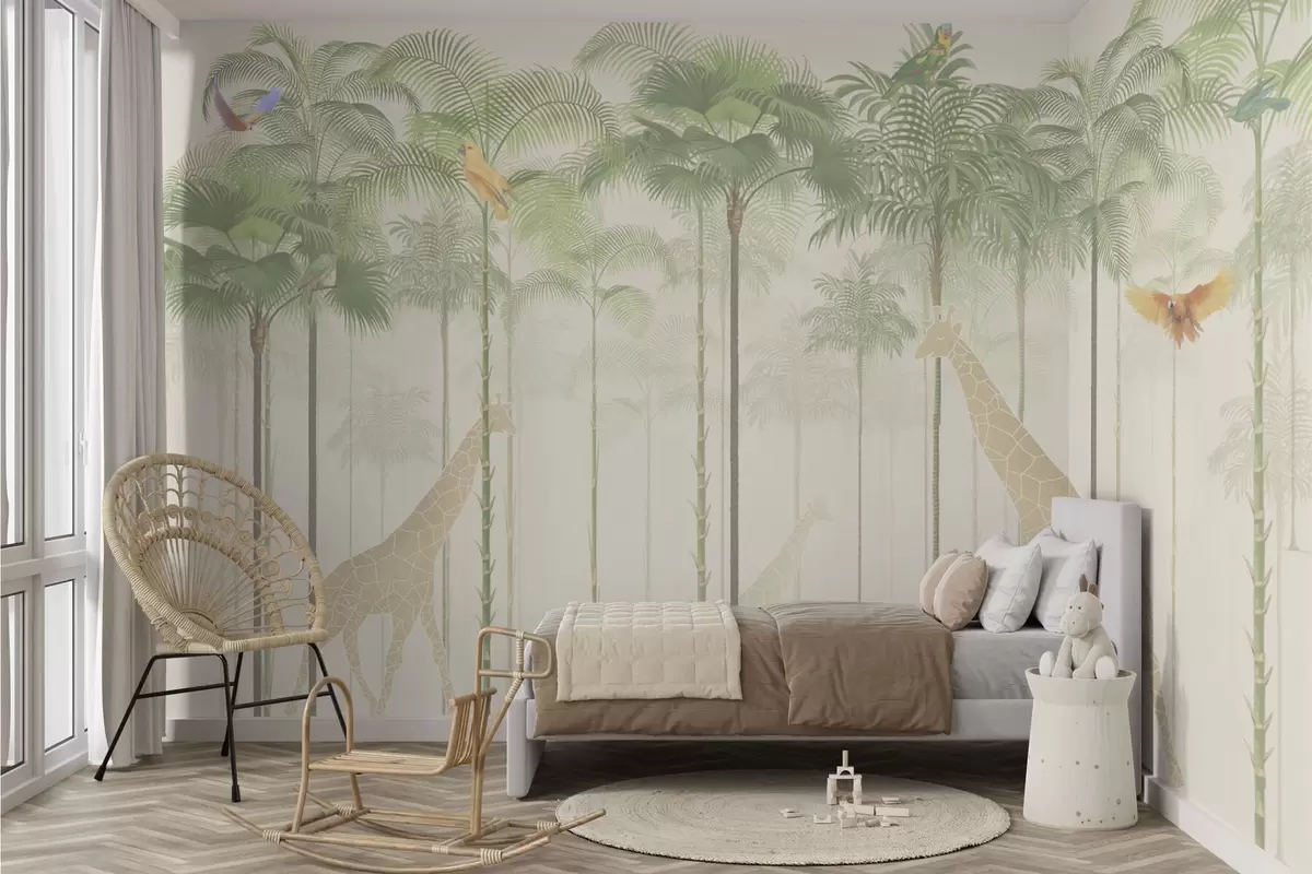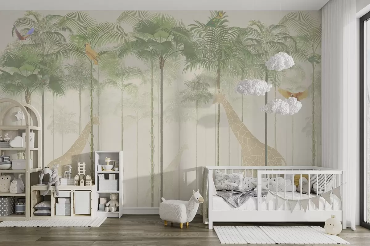 Fotobehang Giraffen en tropische vogels tussen hoge palmbomen N° w04400