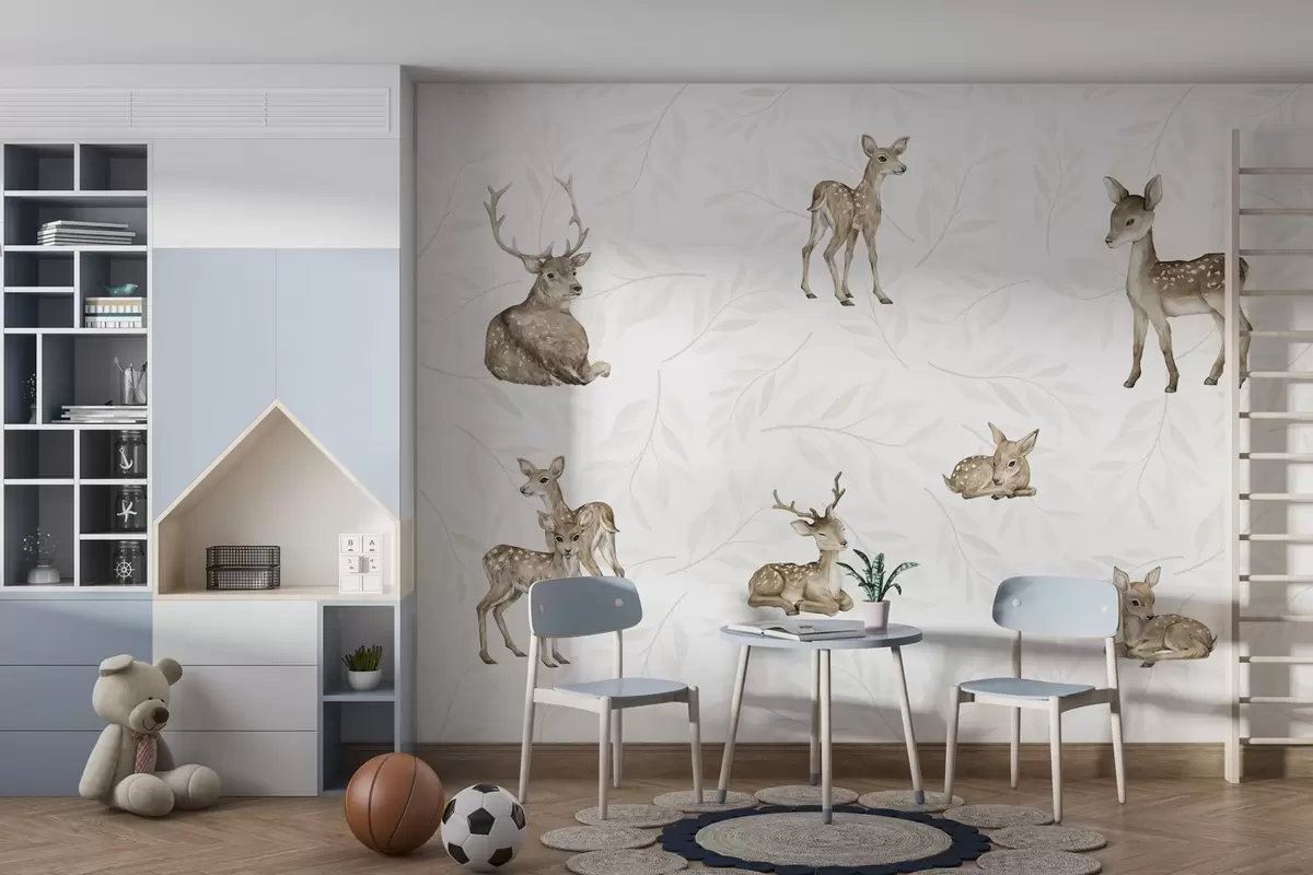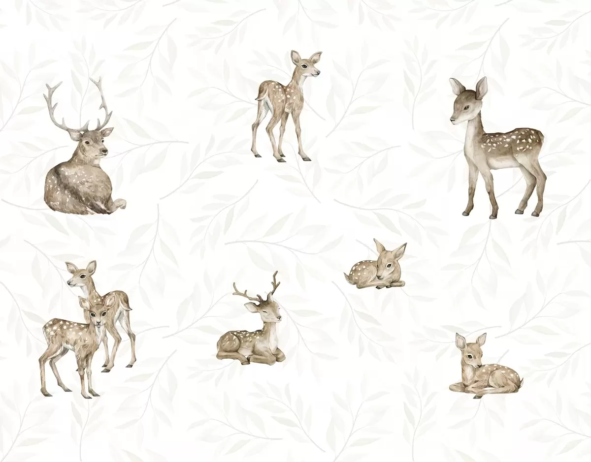 Fotobehang Schattige reekalfjes op een lichte achtergrond met takjes N° w04461