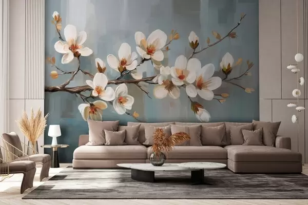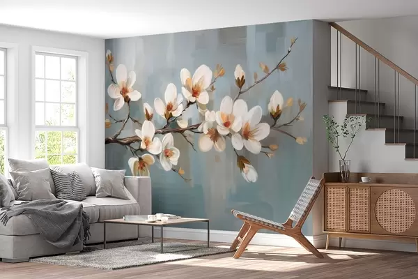 Fotobehang Een bloeiende tak in de stijl van olieverfschilderij op een blauwe achtergrond N° w04496