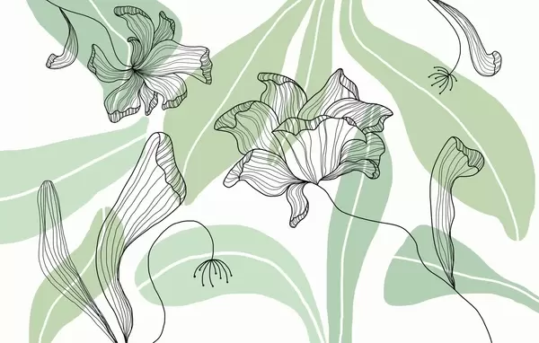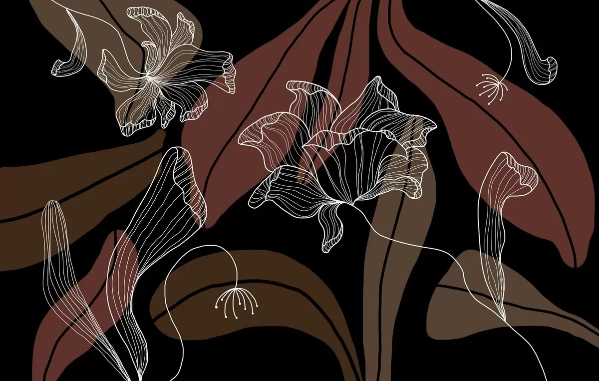 Fotobehang abstracte bladeren en bloemen in poederachtige en beige tinten op een donkere achtergrond N° w04499v3