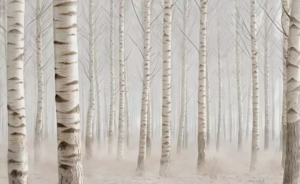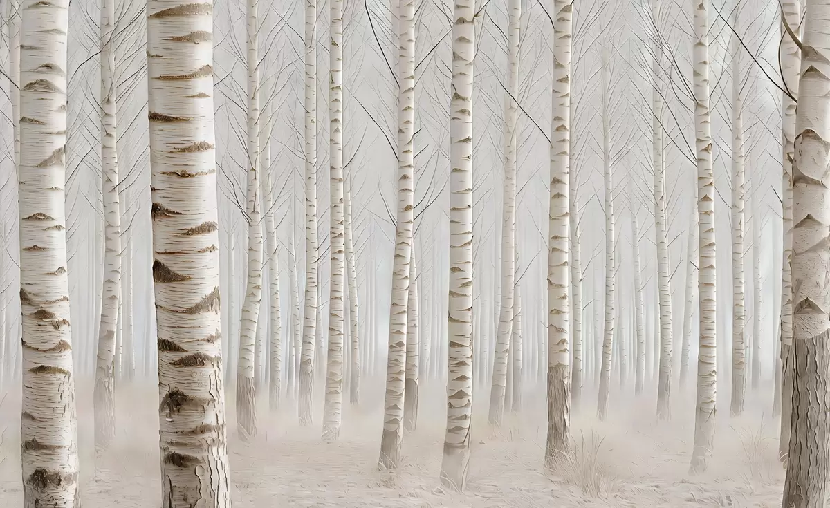 Fotobehang Berkenbos in de mist, licht minimalisme N° w04574