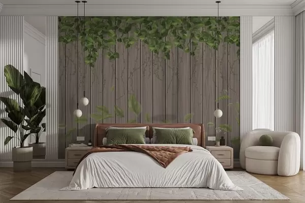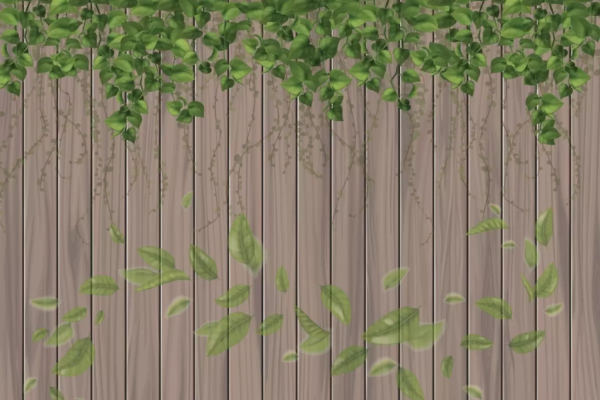 Fotobehang Imitatiehouten planken met hangende bladeren N° w04603